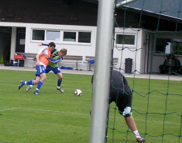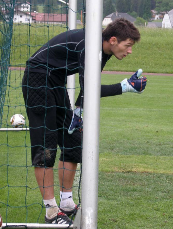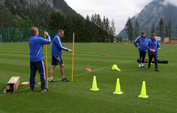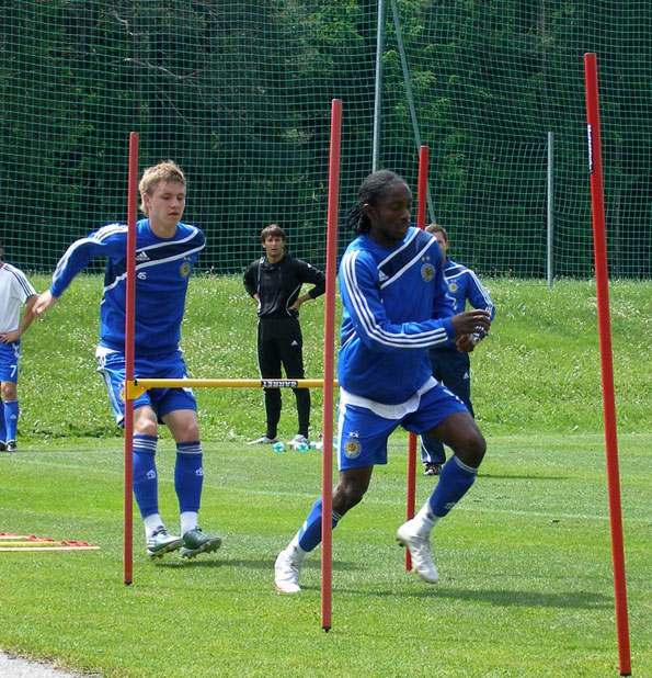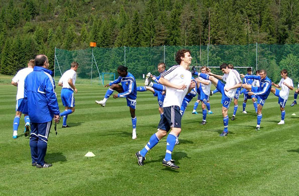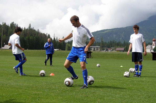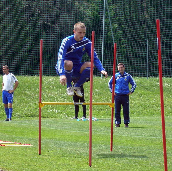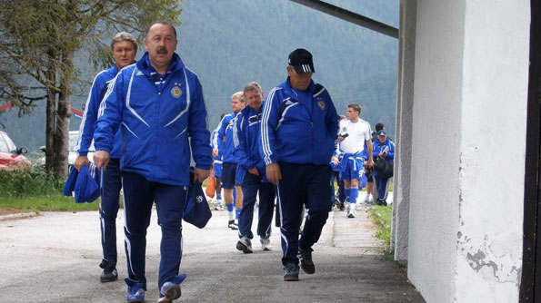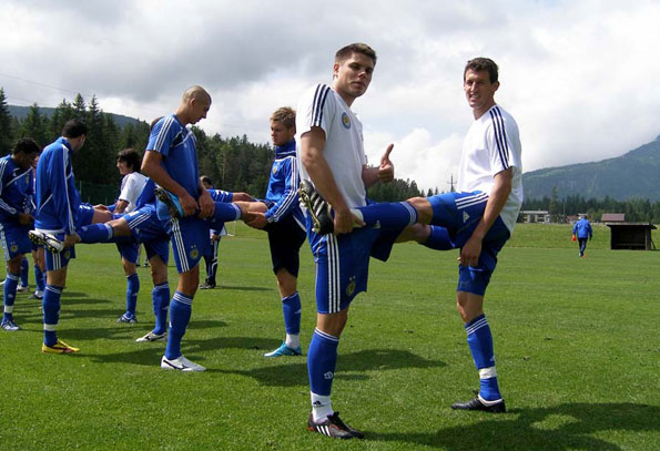 Тренировка "Динамо", фото www.fcdynamo.kiev.uaВплоть до первого контрольного матча, 21-го июня, против питерского «Зенита», на подготовительном сборе в Австрии динамовцев ждут ежедневные двухразовые тренировки. На ближайшие восемь дней расписание команды спланировано с точностью до минуты, свободное время у игроков есть лишь перед сном и используют его, чаще всего, для просмотра матчей Кубка мира.Итак, в 8:00 – подъем. Приведя себя после сна в порядок, игроки идут на медобследование, после которого в 8:40 - завтрак. Спустя два часа команда собирается на теоретическое занятие, затем отъезд на футбольное поле и в среднем полуторачасовая тренировка. В полвторого обед, затем тихий час и снова «теория» с тренировкой. Больше всего в столь плотном распорядке дня динамовцы рады восстановительным процедурам – сауне, бассейну с холодной и горячей водой. Посещение этих обязательных для профессиональных футболистов мест предшествуют ужину, который начинается в 20:30 и после которого до отбоя, а «колокольчик» звенит в 23:00, у игроков два свободных часа. Учитывая, что в это время идет третий матч игрового дня Кубка мира, несложно предположить, на какой канал настроены вечером телевизоры динамовцев.На тренировках наряду с функциональной подготовкой Валерий Газзаев постепенно начинает отрабатывать тактические замыслы. Интересно, какое место и функции на поле наставник отведет новичку Факундо Бертольо? Внешне аргентинец худощав, невысокого роста. Порой задумываешься, как такому с виду скромному парню удается проходить защитные редуты и обыгрывать защитников-гренадеров. Бертольо очень подвижен и техничен, владеет хорошим пасом. В одной из двухсторонок Валерий Газзаев выпустил атакующее трио Бертольо-Милевский-Шевченко и выглядело оно довольно убедительно. Наверняка в планах тренера и другие вариации, которые будут наигрываться на тренировках и в контрольных матчах. А Бертольо, тем временем, за относительную внешнюю схожесть со своим знаменитым соотечественником получил от новых партнеров прозвище «месси».В первые дни в тренировках участвуют два вратаря – Шовковский и Бойко. Стас Богуш остался в Киеве, восстанавливается после травмы. Поначалу тренеры решили третьим кипером взять Артема Кичака, но за несколько дней до сбора он получил досадную микротравму и выбыл предположительно на две недели. После этого выбор пал на Артуре Рудько, воспитаннике клубной школы, в прошлом сезоне выступавшем за «Динамо-2». Однако в связи с выходными оформление документов на Рудько для вылета в Австрию затянулось, теперь в расположении команды 18-летнего вратаря ждут в понедельник-вторник. ТакжеИнтересная делегация на двух спортивных машинах синего и оранжевого цвета с украинскими номерами подъехала в воскресенье на утреннюю тренировку. Вышедшие из них молодые люди сфотографировались с игроками, а затем приоткрыли цель своего визита. Автотуристы намерены проделать путь из Киева до Сицилии и обратно, попутно осматривая европейские достопримечательности, а «накрученное» за это время количество километров (таковых, предположительно, будет около восьми тысяч) перевести в евро и направить в детские дома на благотворительные цели. Об этом говорили и наклейки на авто со слоганом «Детство без насилия». Узнав, что невдалеке от их маршрута базируются динамовцы Киева, а