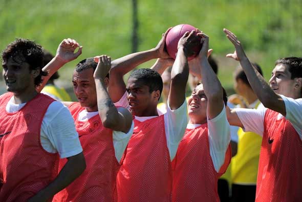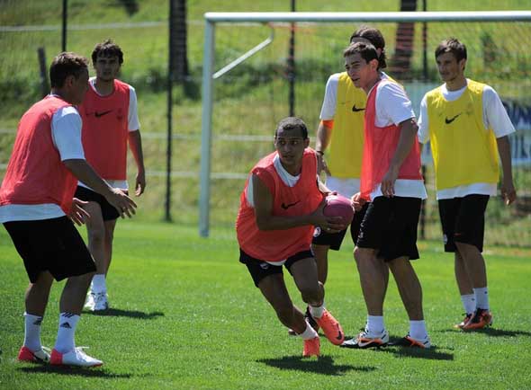 18 июня работа протекала по сценарию, аналогичному тому, что был принят день тому назад. То есть после завтрака одна группа работала в фитнес-центре, затем все вместе отправились на стадион, перед вечерней тренировкой другая группа потрудится на тренажерах, прежде чем отправиться лить пот на футбольном газоне.