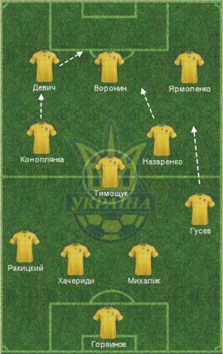 Таким обстояло дело до перестройки по прошествии первого часа игры, когда выход Бутко переместил Гусева на место Коноплянки, а нацеленный больше на оборону Ротань заменил Назаренко. Схема игры стала больше соответствовать 4–2–3–1.