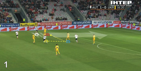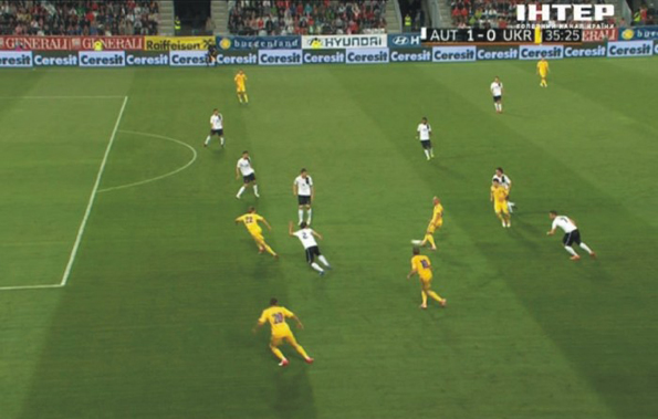 Вспоминая весьма своеобразное построение команды в мартовском матче с Израилем, стало отчётливо ясно, в какую сторону гнёт Блохин в построении игры команды, и в первую очередь это касается атаки. Очевидно, что располагая неплохим подбором футболистов в этой линии, Блохин не стал «размазывать» его по альтернативным вариантам, а сконцентрировал трио Девич–Воронин–Ярмоленко в виде ударного звена, присутствие которого на поле, видимо, следует ожидать впредь в каждом матче. По крайней мере, кроме игр с соперниками, для которых предусмотрена специальная тактика.Однако первые же минуты продемонстрировали острейшие проблемы в совсем другом – защитной линии нашей сборной, которая оказалась неспособной начать атаку в элементарной ситуации.После нарушения на Девиче и назначенного штрафного, разыгрывая который уже можно было перевести мяч вперёд, защитники начинают в нерешительности передавать его друг другу, словно раскалённую головёшку. Крайним раз за разом остаётся Хачериди, который и так не обладает креативным пасом. В результате – острый момент на ровном месте, и только нехватка умения у нападающего австрийцев, который отпасовал во «вне игры» из опаснейшего положения, спасла от неприятностей.