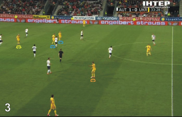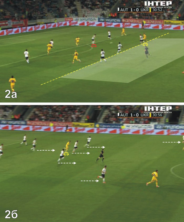2а. Атакует сборная Украины. Выше линии мяча (желтая) 5 футболистов + Ярмоленко, отдающий передачу. Много игроков в атаке – хорошо, но их расположение таково, что после потери мяча в красной точке уже через 4 секунды австрийцы атакуют крупными силами, не встречая никакого противодействия игроков, большинство которых даже не попали в кадр 2б, оставшись впереди.